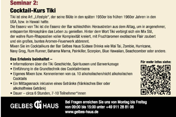 Die Tiki-Kultur oder Tiki-Style bezeichnet eine Modewelle, die ihre Blüte in den späten 1950er bis frühen 1960er Jahren hatte.Hawaii – 1959 zum 50.Bundesstaat der USA geworden, war Traumziel schlechthin für jeden US-Amerikaner in den 1950er Jahren und Projektion für das wieder gefundene Paradies auf Erden. Tiki ist eine Art „Lifestyle“, eine Art und Weise durchs Leben zu gehen. Die Essenz von Tiki ist die Essenz der Bar schlechthin: Heraustreten aus dem Alltag, um in angenehmer, entspannter Atmosphäre das Leben zu genießen. Hinter dem Wort Tiki verbirgt sich ein Mix Stil, eine Mixschule, die ausgeprägter kaum sein könnte. In seinen besten Momenten schafft es der Tiki-Stil, wahre Rum-Rhapsodien voller Komplexität zu kreieren, mit Fruchtaromen exotisches Flair zu zaubern und ein großes, buntes Aromenfeuerwerk abzubrennen.