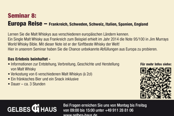Unsere unmittelbaren Nachbarn stellen auch gute Malt-Whiskys her. Aus den sechs genannten Ländern stellen wir je einen interessanten Whisky vor.Verkostung von sechs Single Malt Whiskys a´ 2cl.